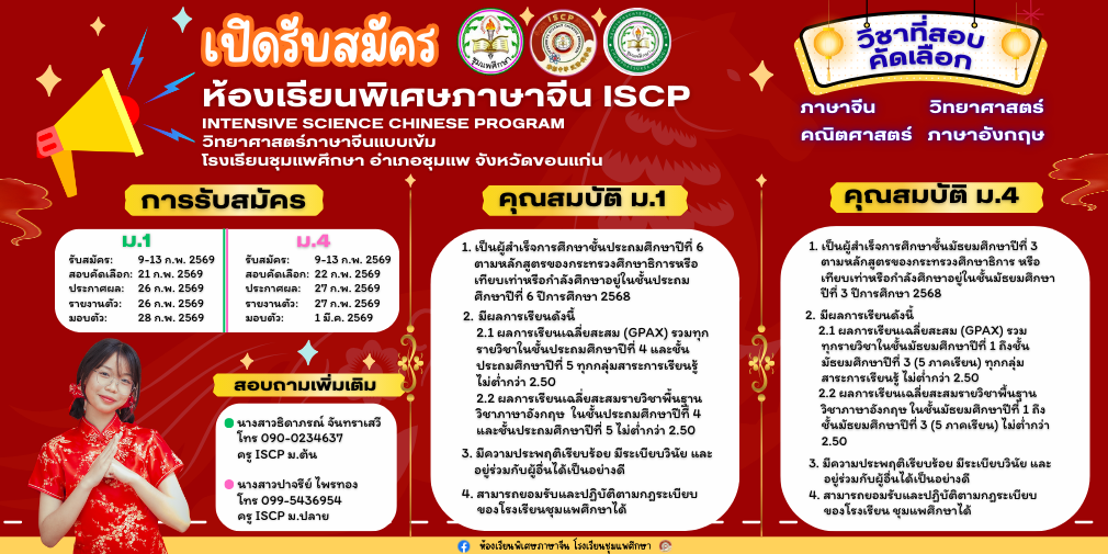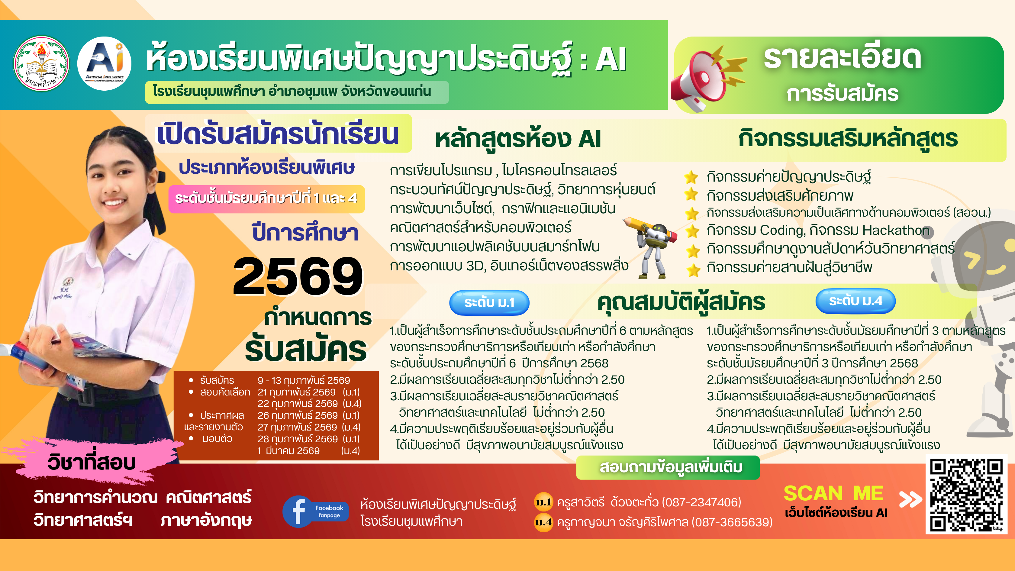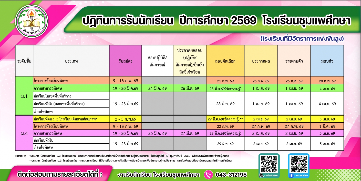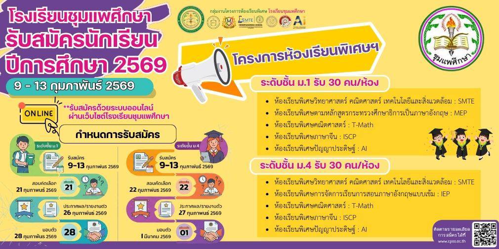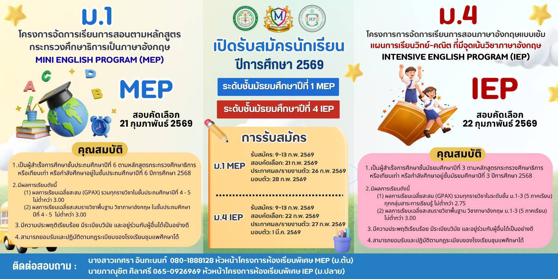 หน้าต้อนรับ ประกาศ การรับสมัครนักเรียนระดับชั้นมัธยมศึกษาปีที่ 1 และ 4 ปีการศึกษา 2569 ประเภท นักเรียนโครงการห้องเรียนพิเศษ เข้าสู่หน้าแรก
