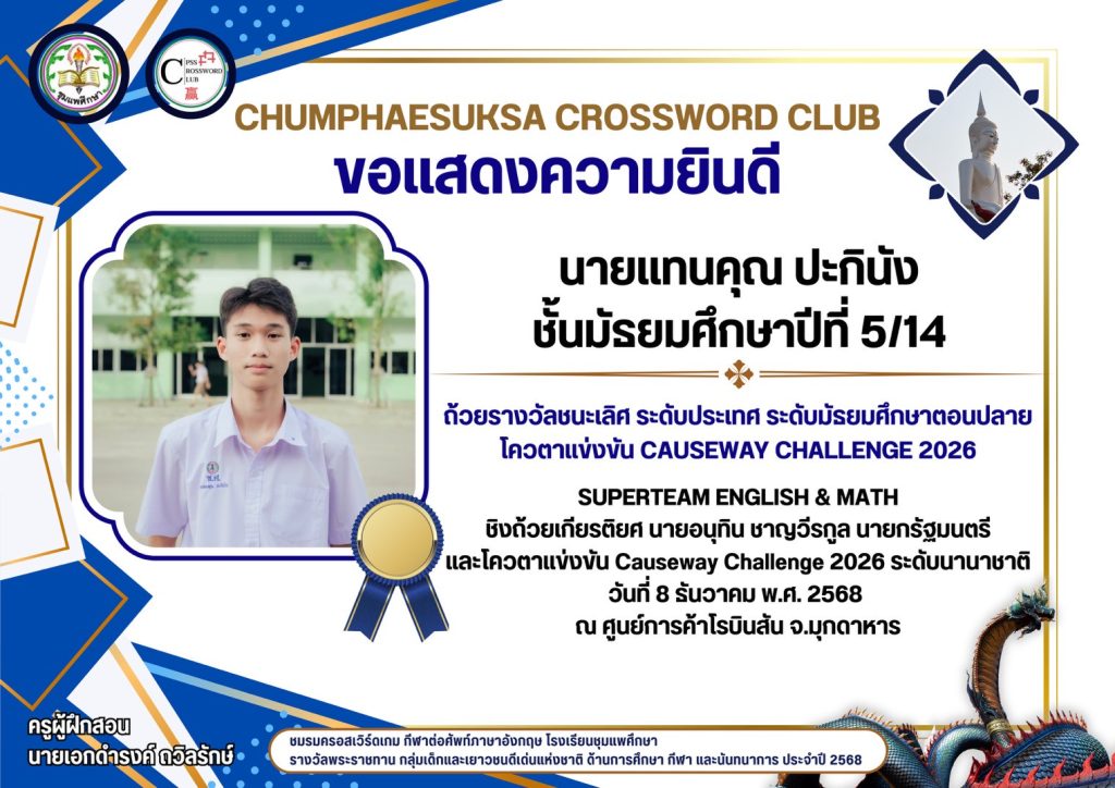 ขอแสดงความยินดี กับ นายแทนคุณ ปะกินัง ชั้นมัธยมศึกษาปีที่ 5/14 ถ้วยรางวัลชนะเลิศ ระดับประเทศ ระดับมัธยมศึกษาตอนปลาย โควตาแข่งขัน CAUSEWAY CHALLENGE 2026 1 เม.ย. 2569สมรักษ์ สิงห์คำรางวัล