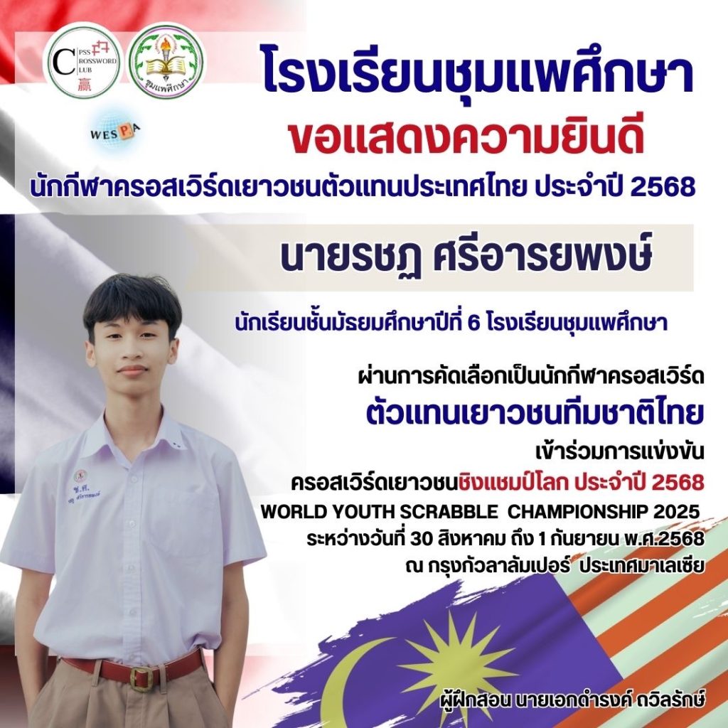 ขอแสดงความยินดี กับ นายรชฏ ศรีอารยพงษ์ นักเรียนชั้นมัธยมศึกษาปีที่ 6 ผ่านการคัดเลือกเป็นนักกีฬาครอสเวิร์ด ตัวแทนเยาวชนทีมชาติไทย เข้าร่วมการแข่งขันครอสเวิร์ดเยาวชนชิงแชมป์โลก ประจำปี 2568