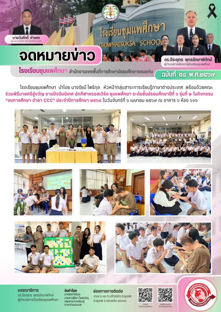จดหมายข่าว ฉบับที่ 58 พ.ศ.2569 ร่วมพิธีบายศรีสู่ขวัญ งานปัจฉิมนิเทศ นักกีฬาครอสเวิร์ด ชุมแพศึกษา ระดับชั้นมัธยมศึกษาปีที่ 6 รุ่นที่ 2 ในกิจกรรม”จบการศึกษา อำลา CCC” ประจำปีการศึกษา 2568 6 เม.ย. 2569สมรักษ์ สิงห์คำวารสารประชาสัมพันธ์