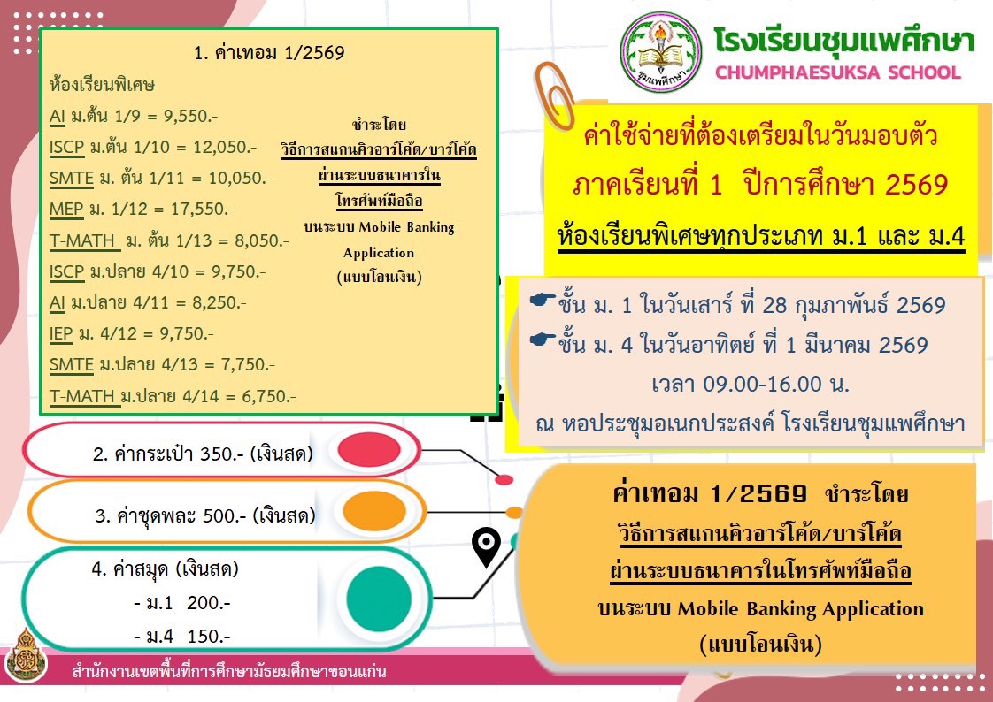 ประกาศค่าใช้จ่ายในวันมอบตัว นักเรียนห้องเรียนพิเศษทุกประเภท ม.1 และ ม.4 ภาคเรียนที่ 1 ปีการศึกษา 2569 27 ก.พ. 2569Adminประกาศโรงเรียน