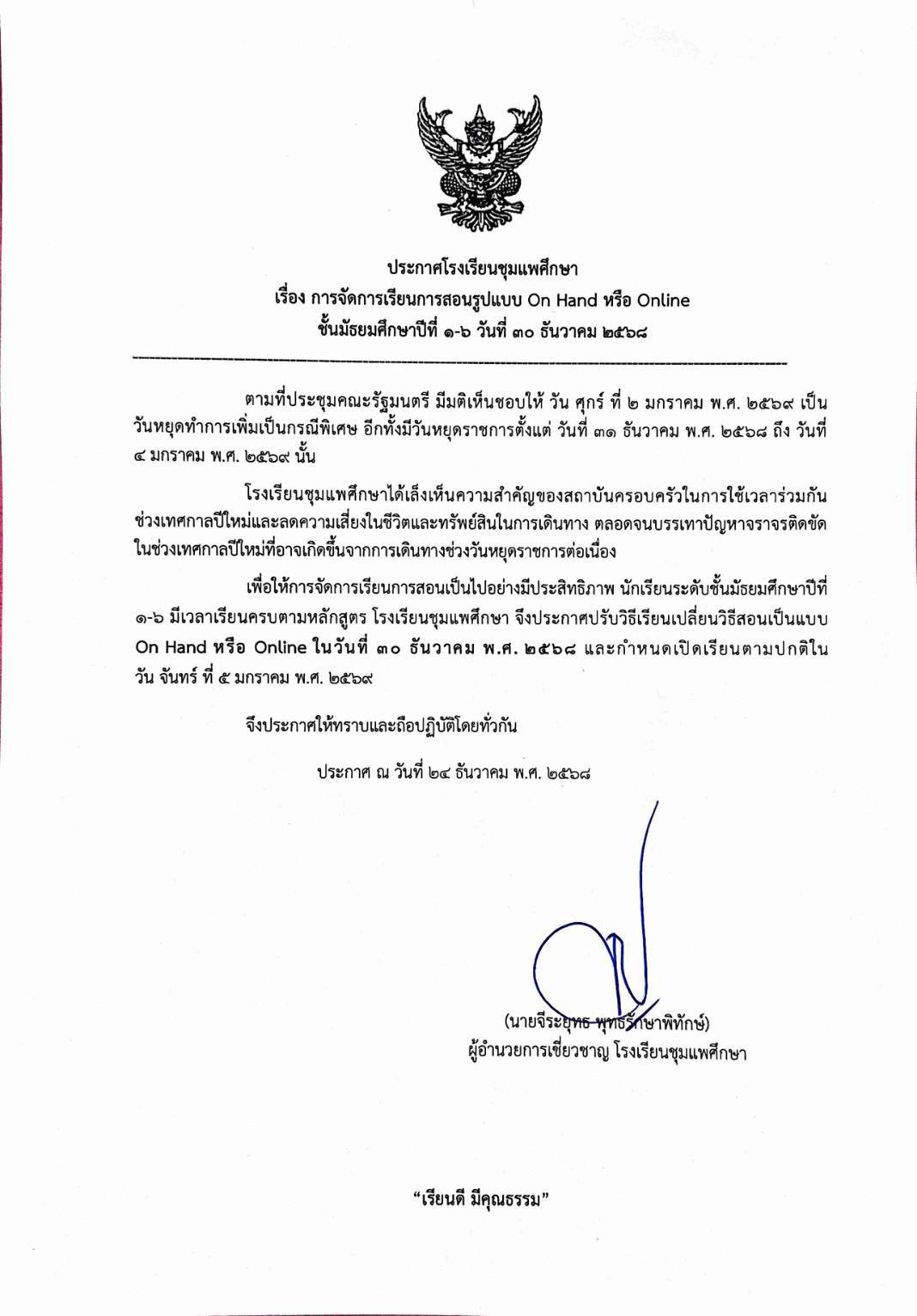 ประกาศ เรื่อง การจัดการเรียนการสอนรูปแบบ On Hand หรือ On line ชั้นมัธยมศึกษาปีที่ 1-6 วันที่ 30 ธันวาคม 2568 25 ธ.ค. 2568Adminประกาศโรงเรียน